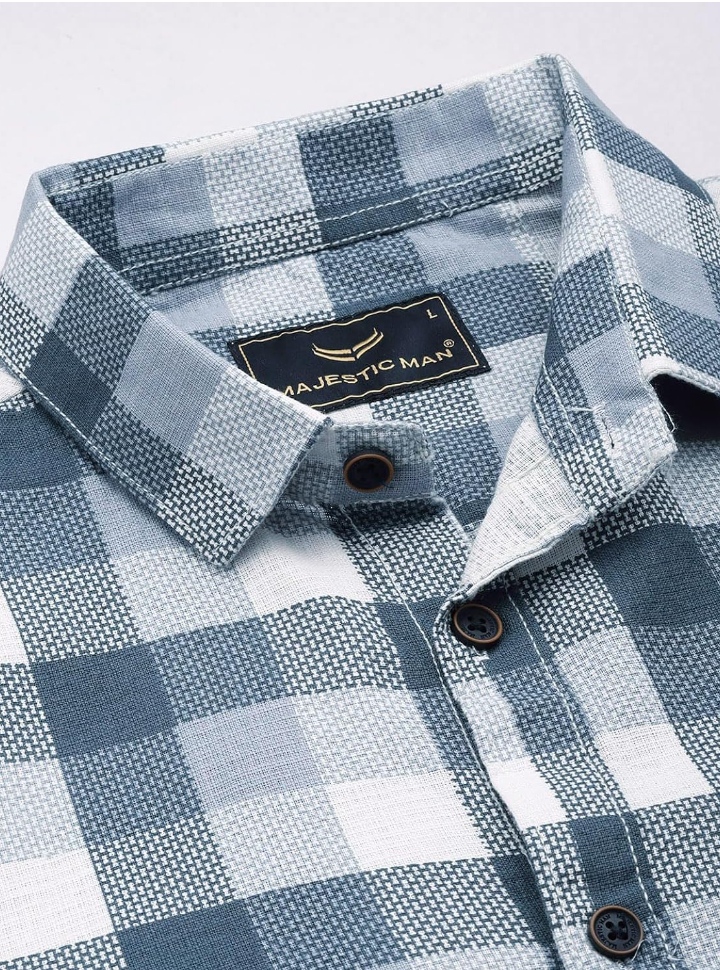 A comfortable and stylish blue and white checkered shirt from Majestic Man, perfect for casual outings or semi-formal events.